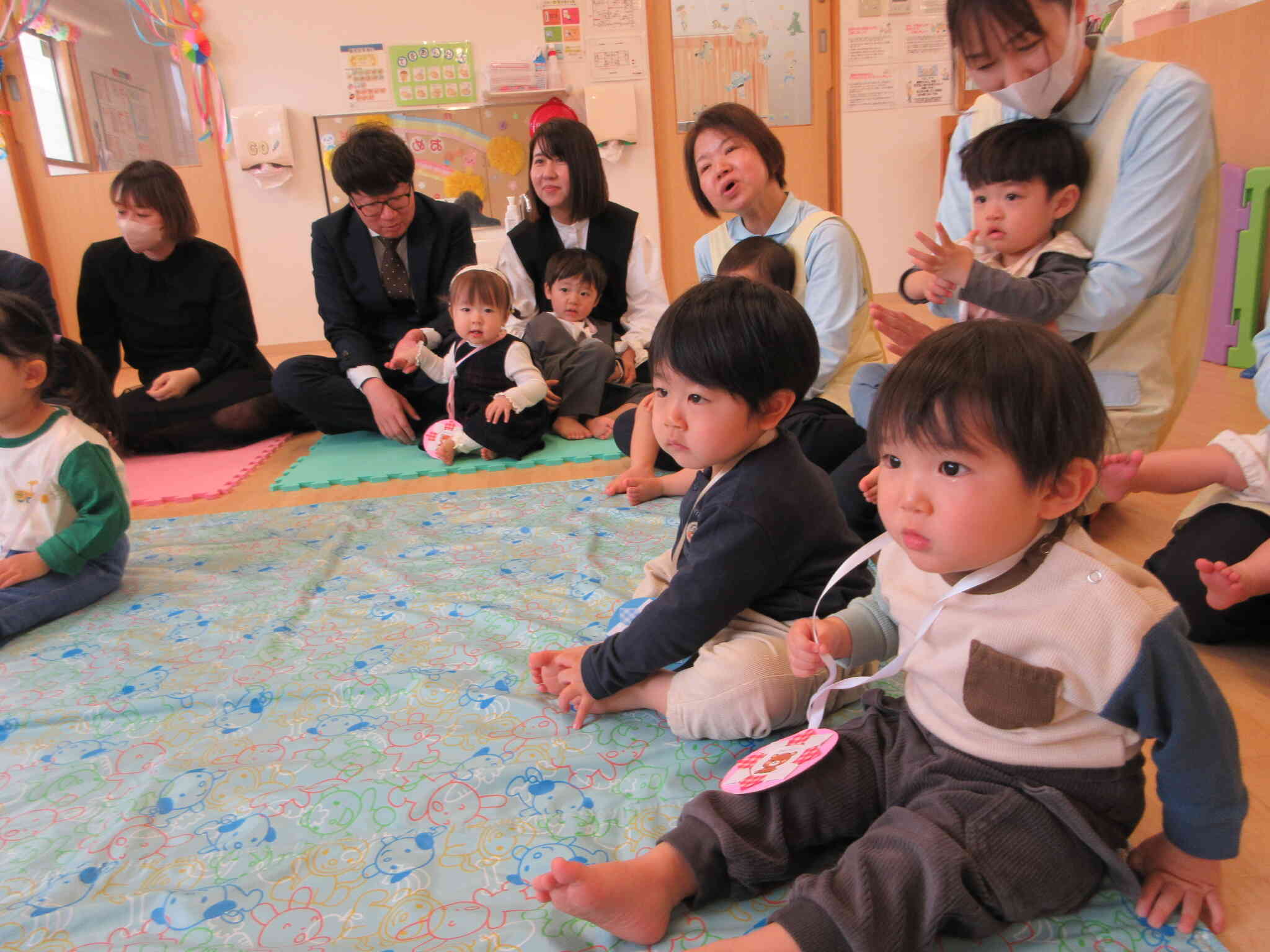 今年度は昨年の途中入園のお子様の保護者様と今年度入園のお子様の保護者様を招待しての入園・進級式で3組の保護者様が参加してくださいました。