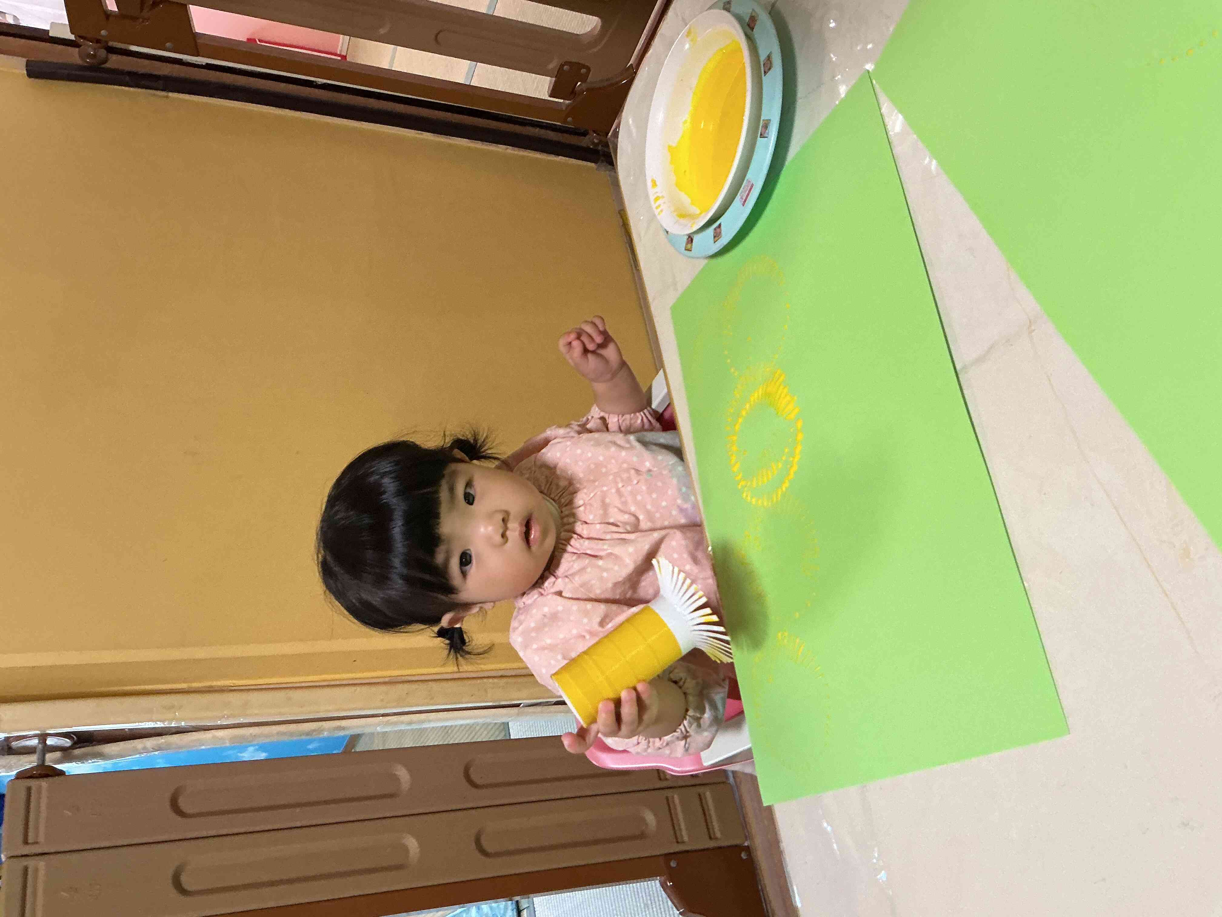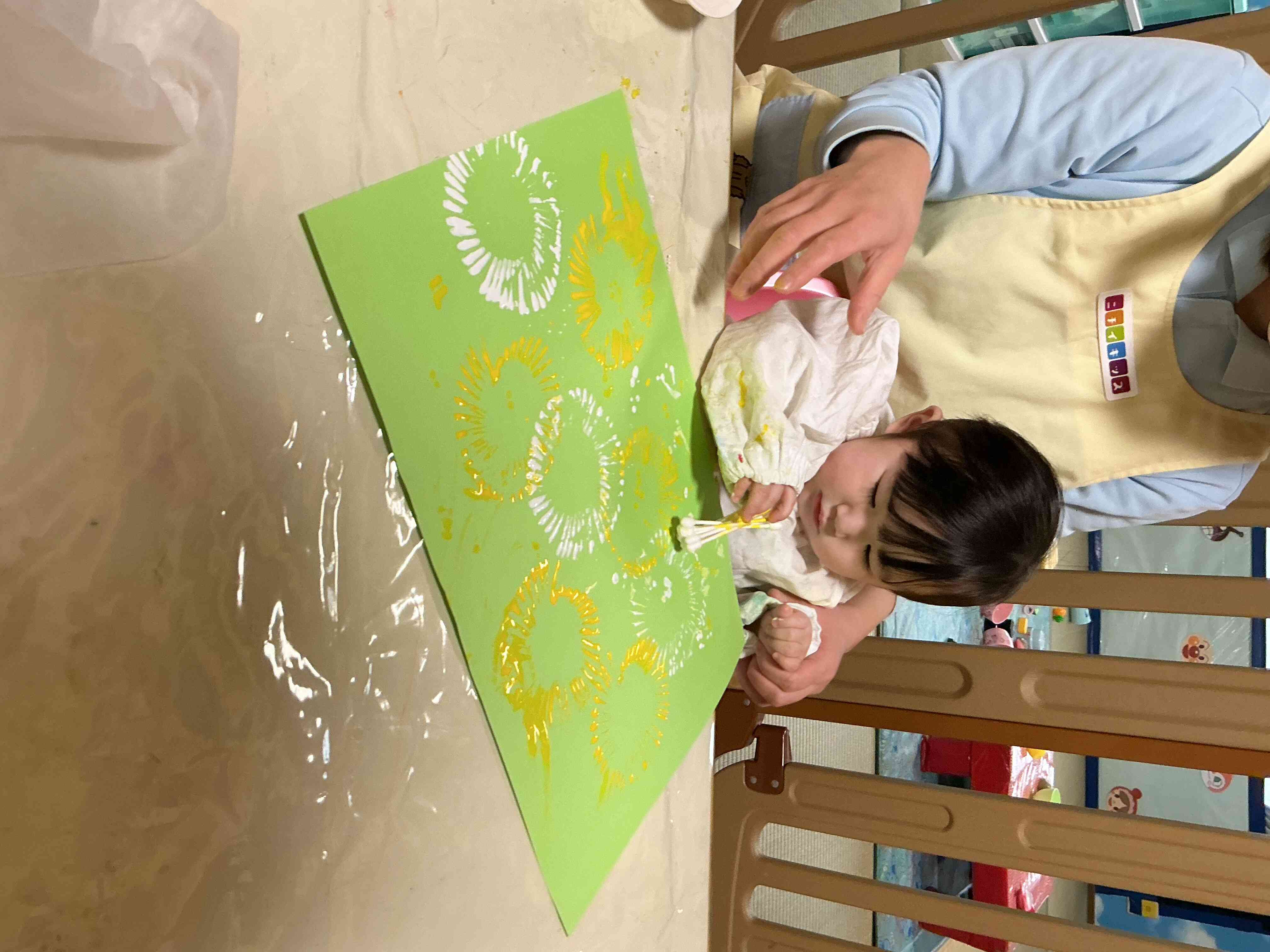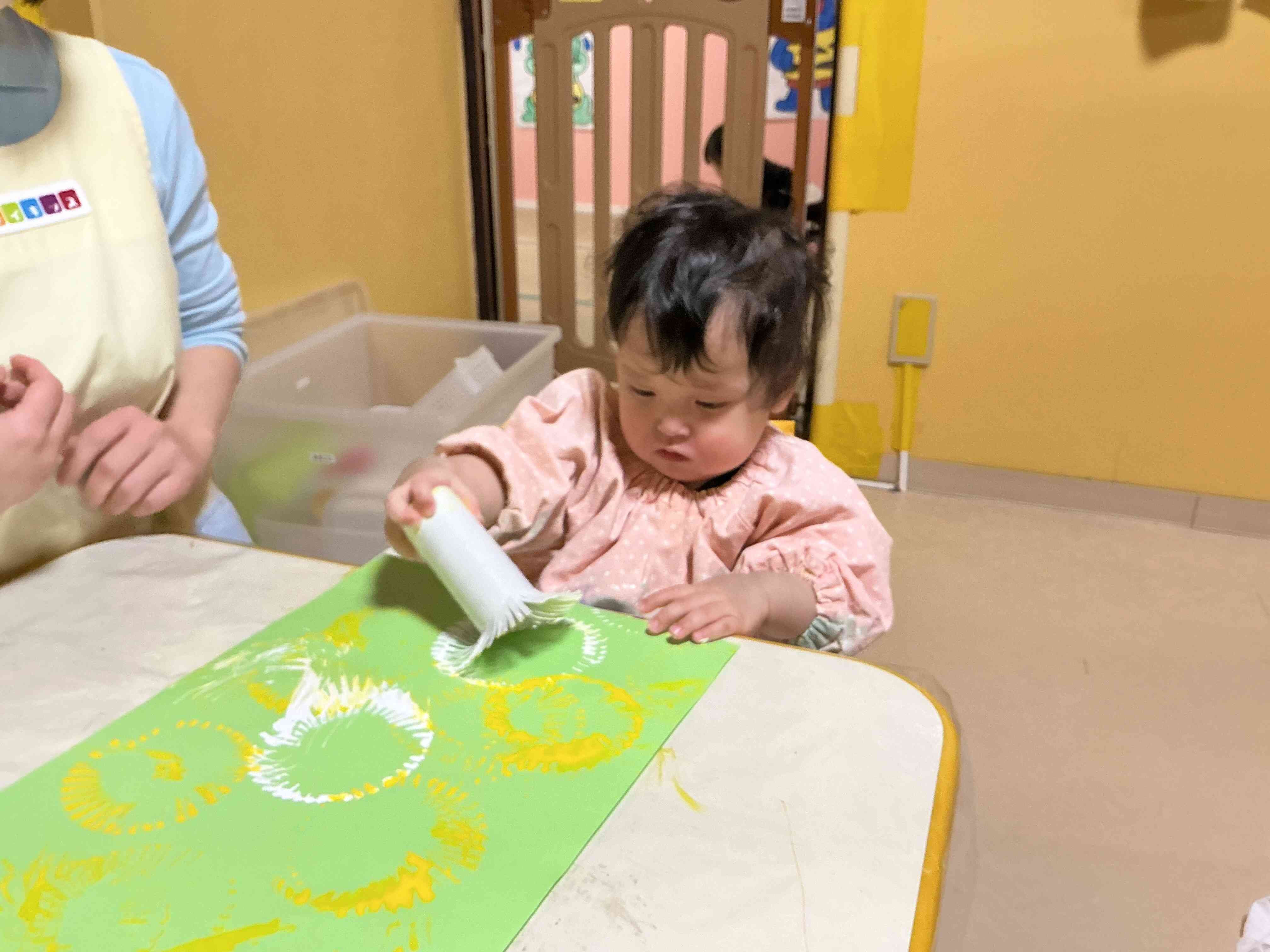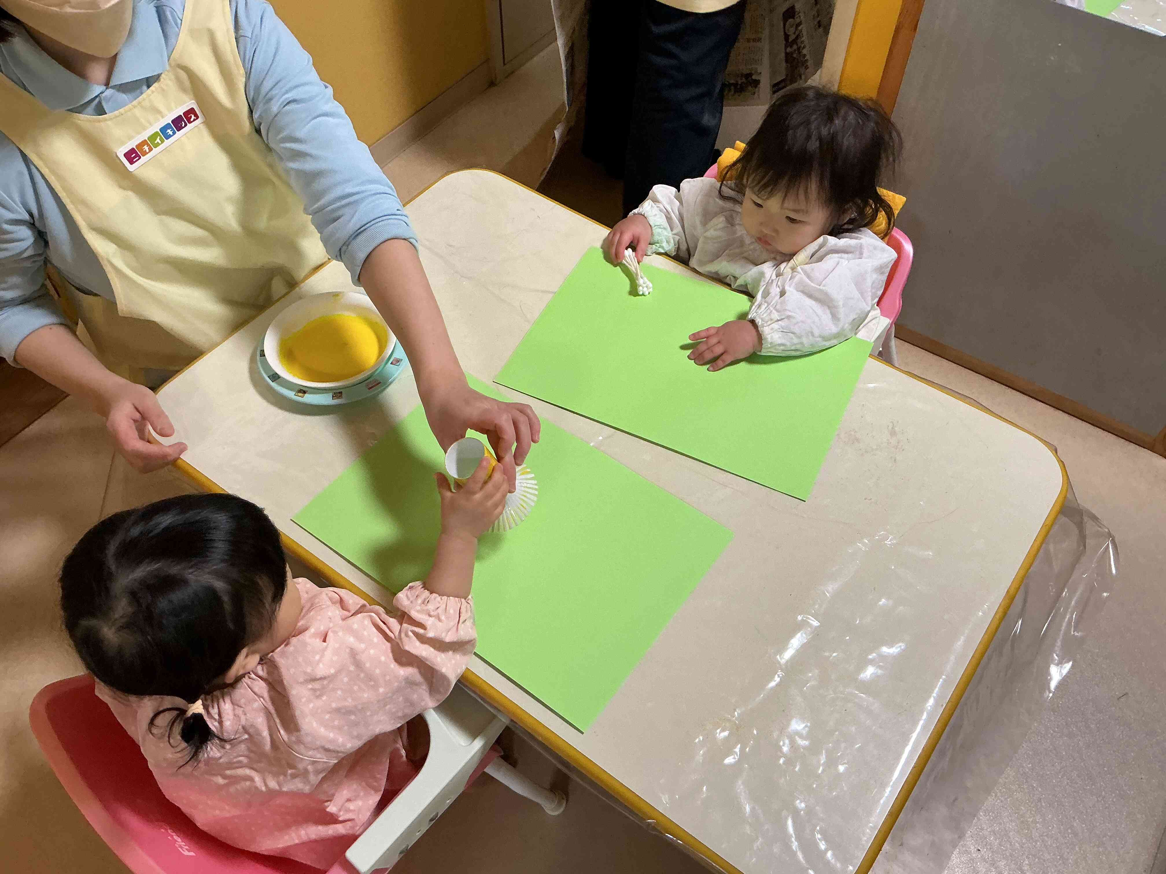 制作遊びでタンポを使い、「たんぽぽ」の花を咲かせました!トイレットペーパーの芯を花びらに、綿棒を束ねた物をめしべに見立てて、絵の具をつけてポンポンと画用紙に押して、動作や色がつく様子を楽しみました。保育士と一緒に行ったり、自分で絵の具をつけて行う様子も見られ、「ぺったん♪」と嬉しそうな表情も満開な子どもたちでした。