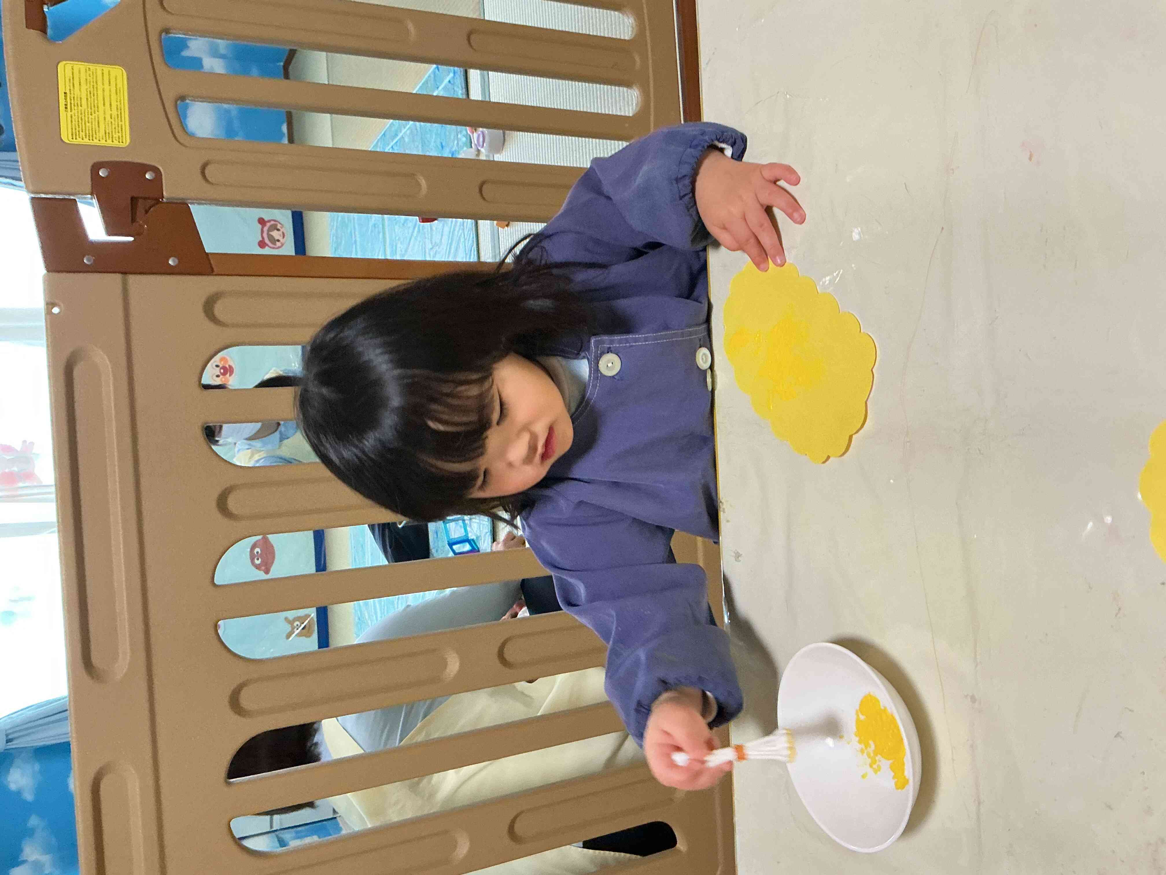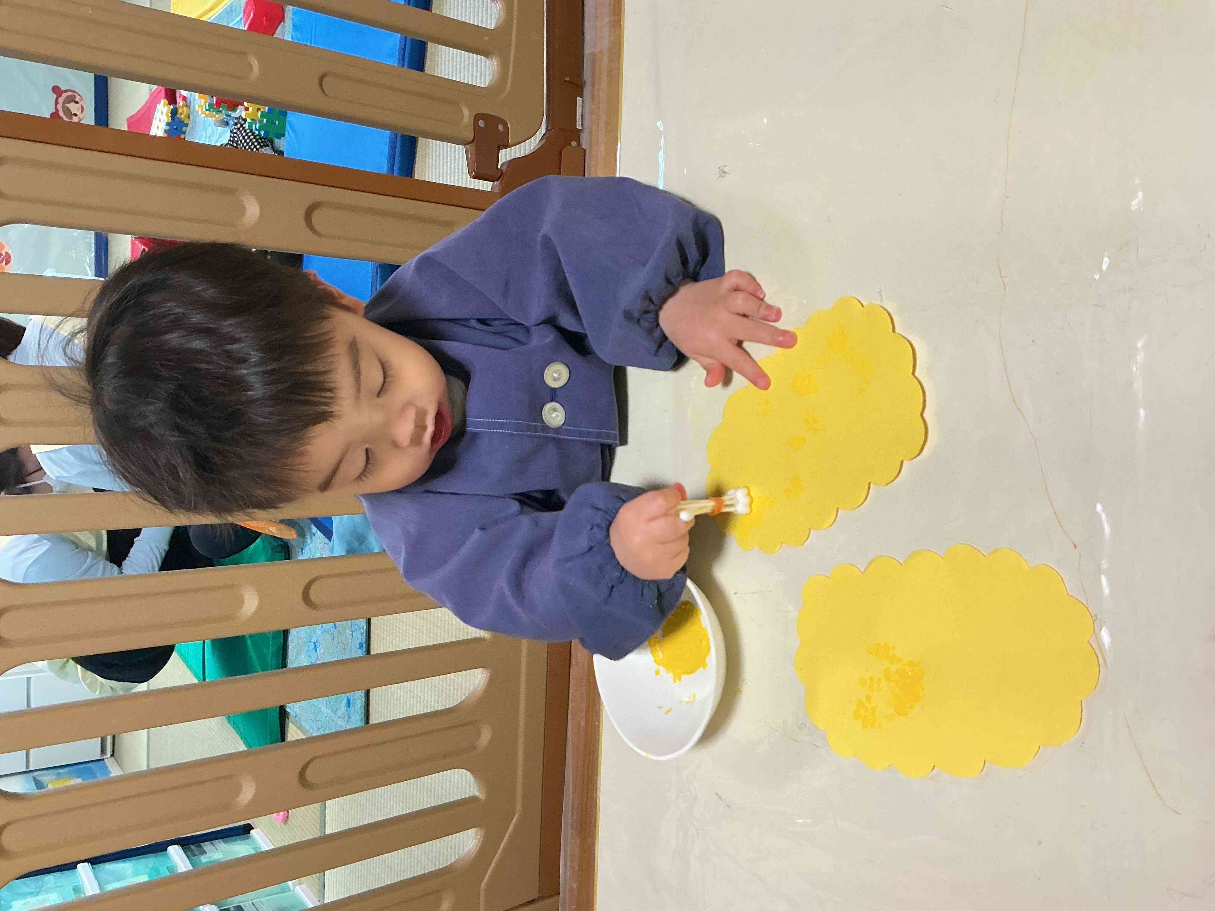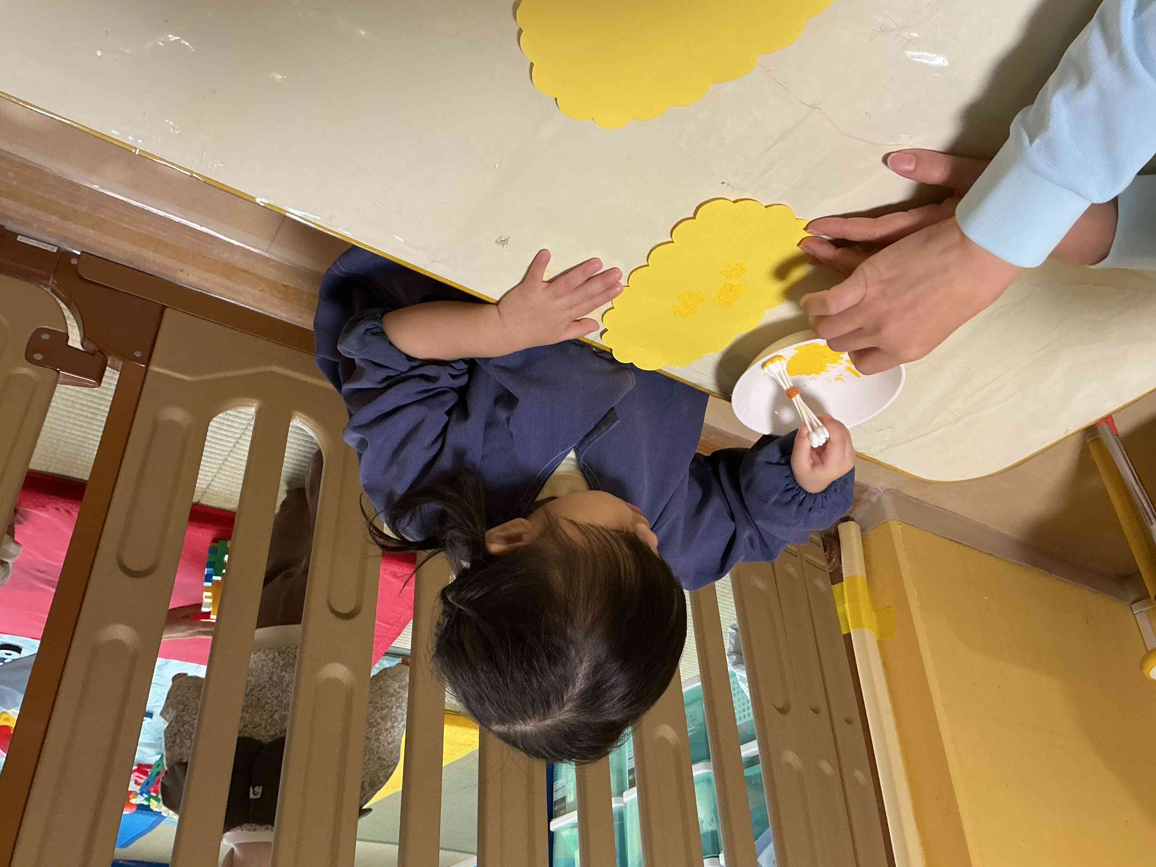 手作りの綿棒スタンプに絵の具をつけて、菜の花作りをしました。「トン♪トン♪」とリズムよく押して、きれいな花を咲かせていました。