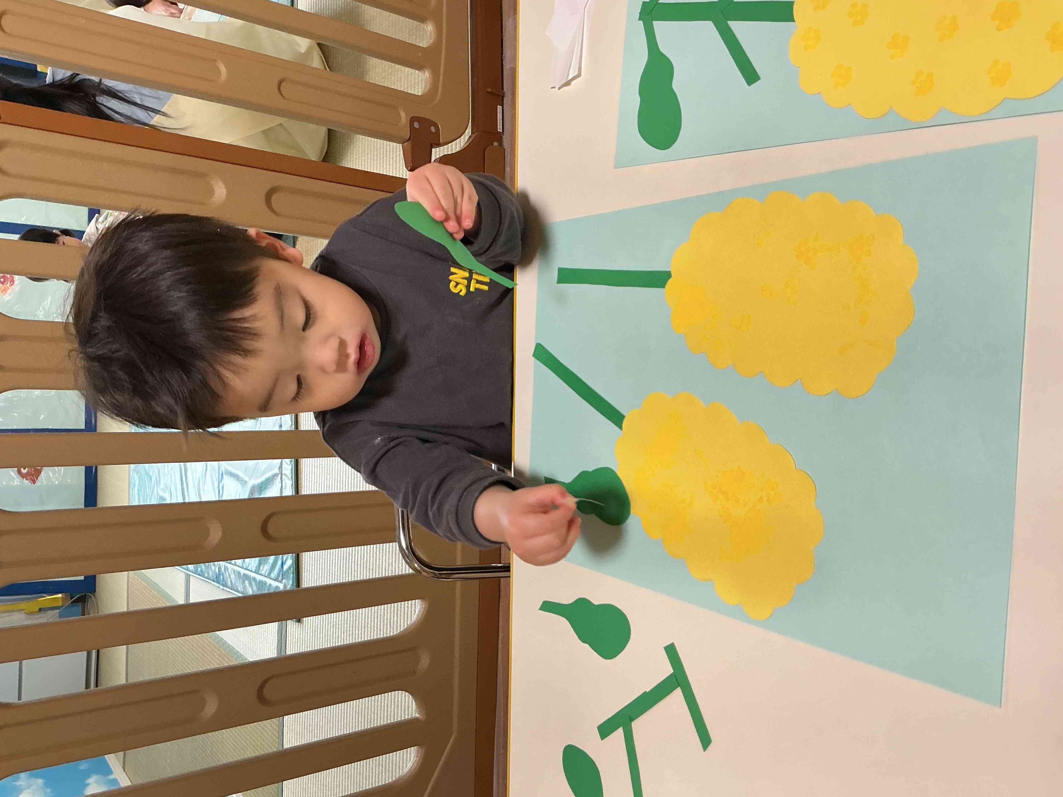 出来上がった菜の花と葉っぱや蝶々を思い思いに画用紙に貼る子どもたち。「ここかな?こっちにしようかな?」と考えながら真剣に貼っていました。「ちょうちょ〜、なのはにとまれ〜♪」と保育士と一緒に歌を歌いながら楽しそうに貼って、満足そうな笑顔の子どもたちでした。