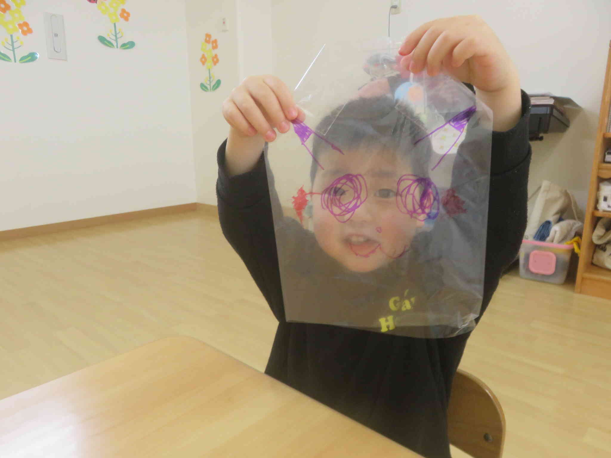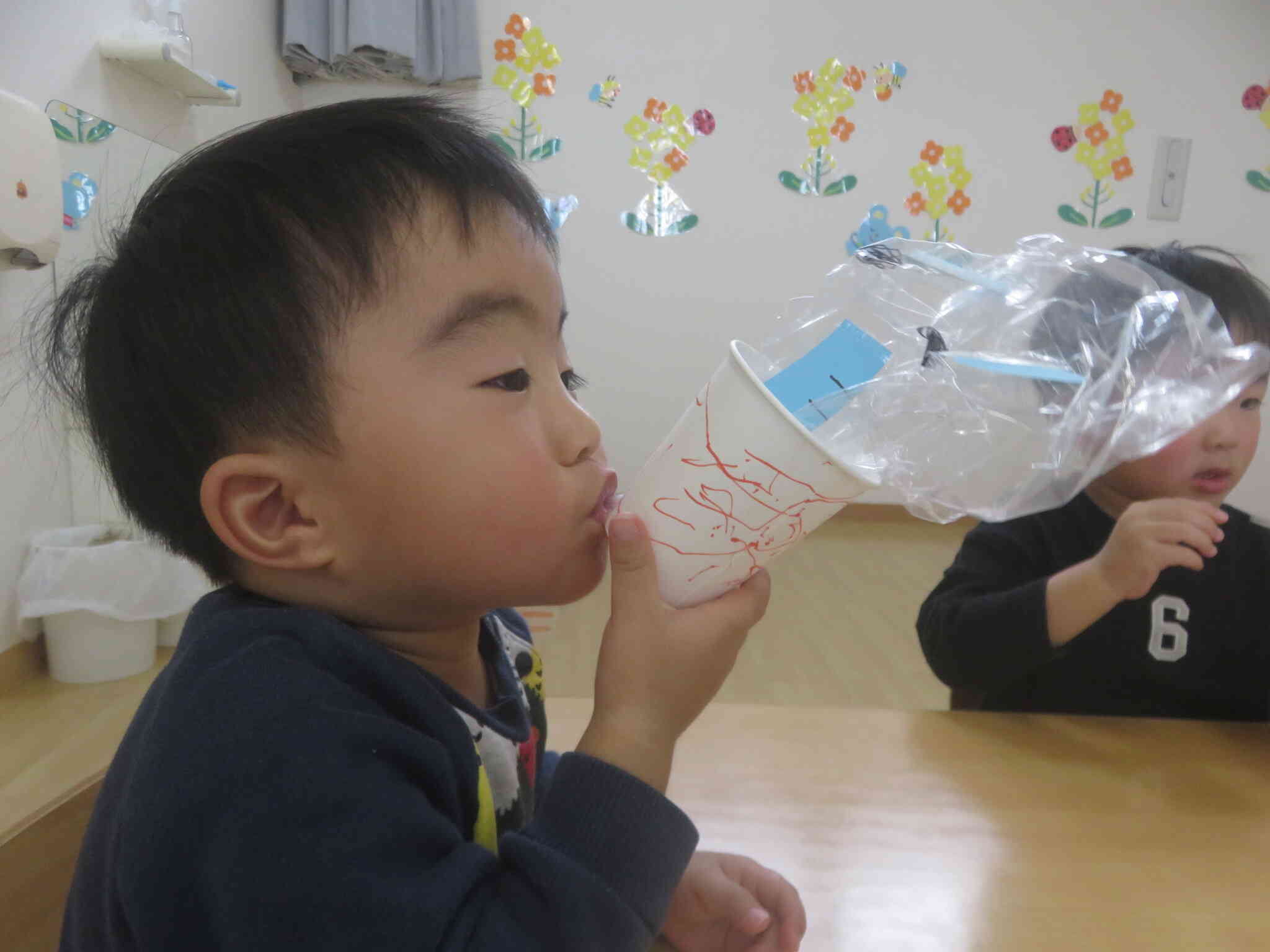 完成すると、思い切り息を吹き込み、上手く膨らむと、「もう一回!もう一回!」と言って何度も楽しんでいました☆