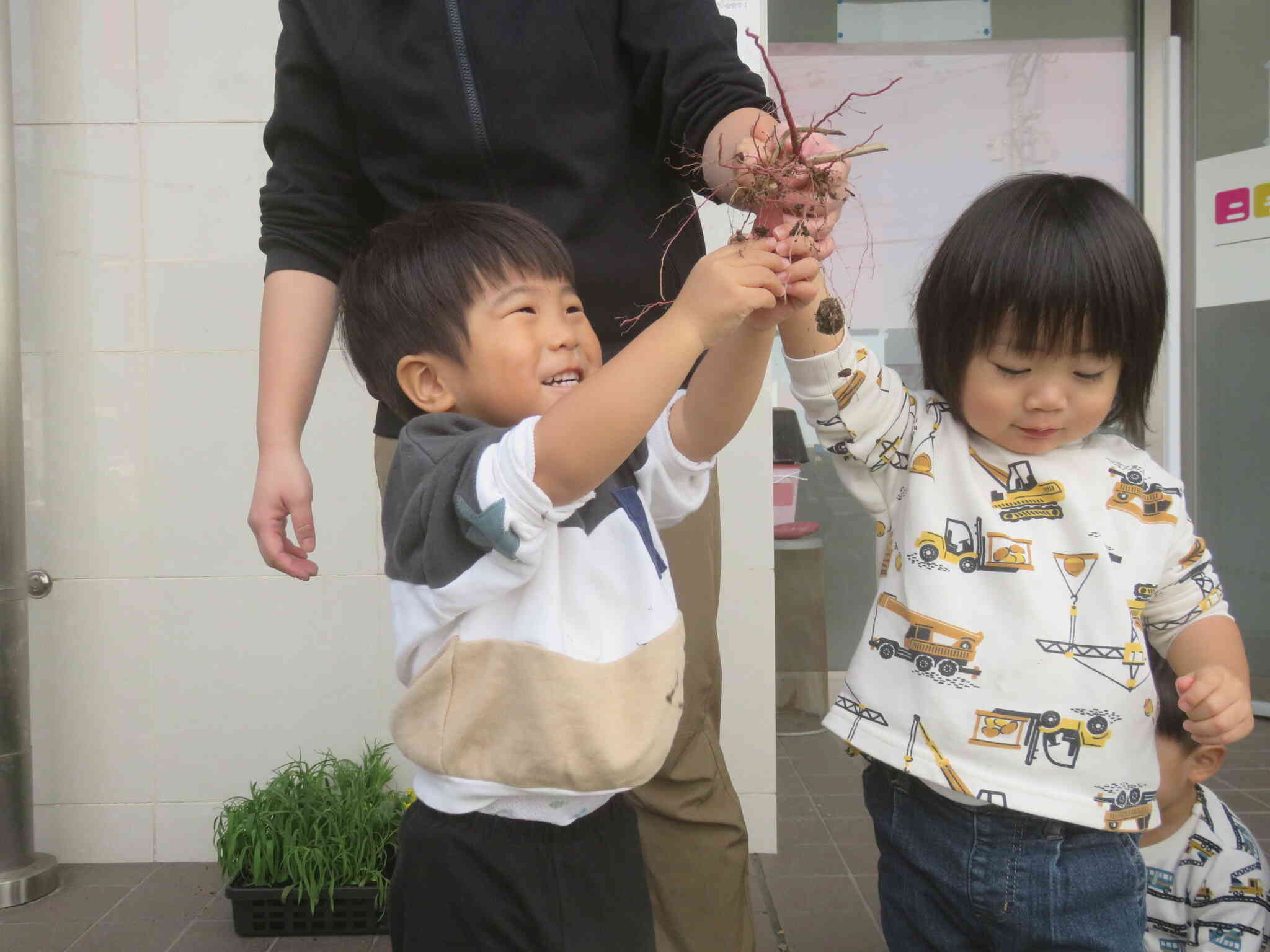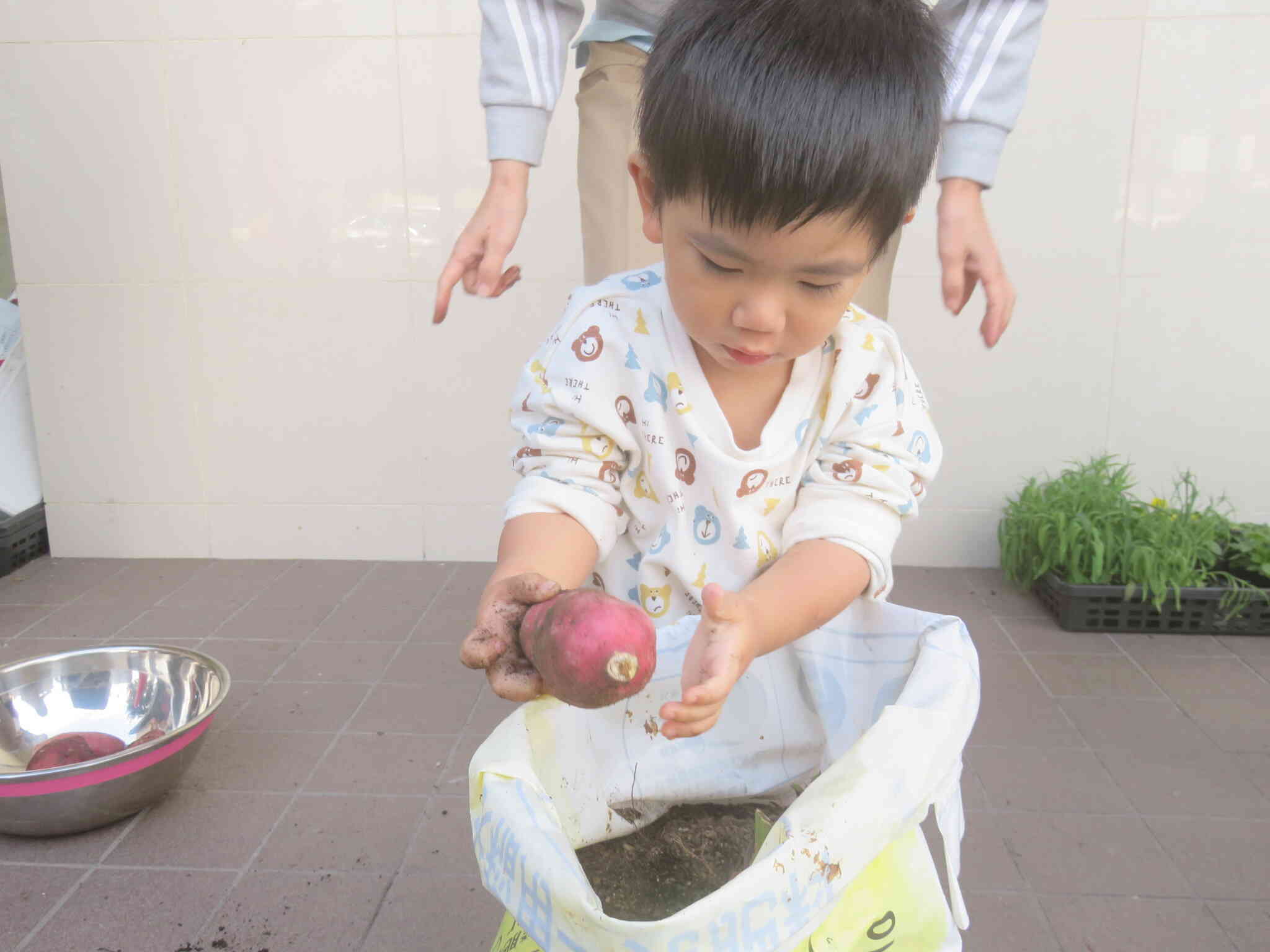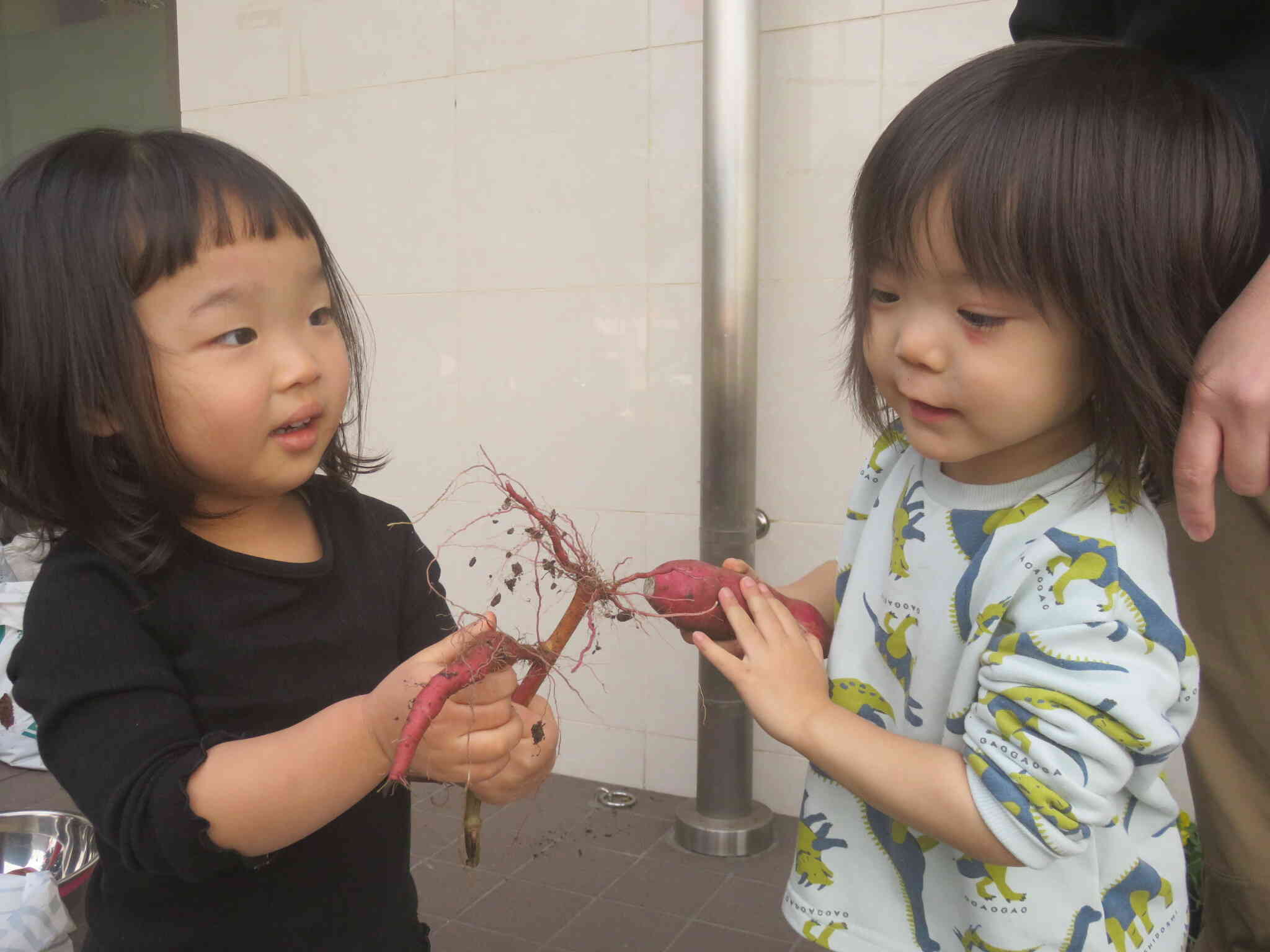 あひる組さんは、芋をみつけると嬉しそうに手で持ち