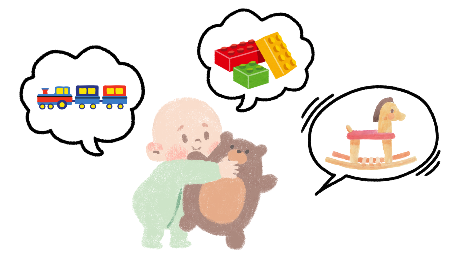 お子様の成長発達には個人差がありますが、おおよその年齢に合わせたおもちゃを選ぶことで、より興味を引き出したり、遊びの世界を広げたりできます。